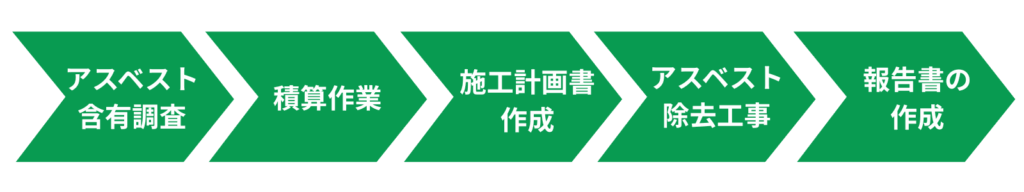 アスベスト除去事業では、アスベスト(石綿)含有の調査から、見積もり、施工計画の作成と現場施工、廃棄物の搬出・処分、報告書の作成まで一貫して対応しています