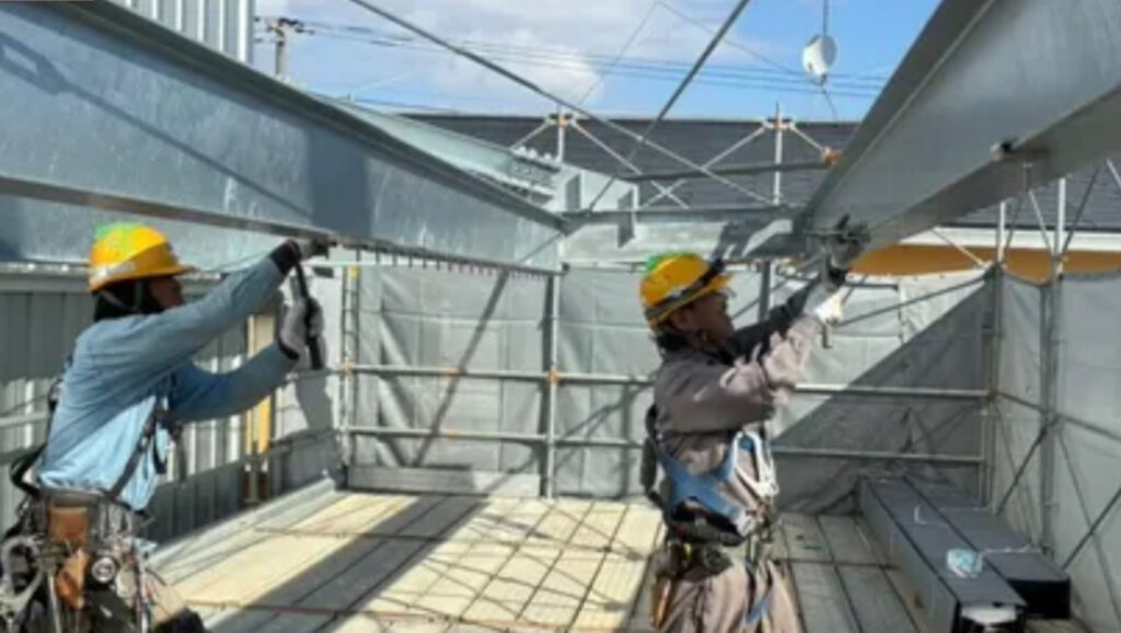 福島県郡山市にて、弊社の鉄骨班と外装班(福島班)が連携し、各施工を担当いたしました。 今回は、鉄骨班による溶融亜鉛めっき庇の取付工事と、外装班による吊り折板屋根の施工という、社内コラボレーションでの現場となりました。